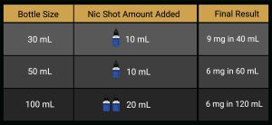 برای استفاده از شات نیکوتین ۳۶ میلیگرم، طبق تصویر و جدول زیر عمل کنید. برای مثال اگر یک شات نیکوتین ۳۶ میلی گرم را به ۵۰ میلی لیتر محلول پایه اضافه کرده و کاملا مخلوط کنید، ۶۰ میلی لیتر محلول با غلظت ۶ میلی گرم خواهید داشت. لطفا به اعداد مربوط به حجم محلول پایه و تعداد شات افزوده شده دقت نمایید و از افزایش بیش از حد نیکوتین در محلول نهایی خود جدا خودداری فرمایید.
